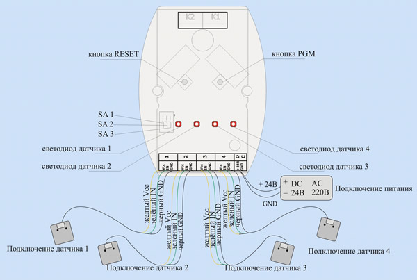 Одиночным нажатием кнопки PGM запускается программа поиска подключенных датчиков. Светодиод соответствующего датчика начинает моргать, в случае обнаружения датчика светодиод остается гореть и начинает сканирование следующего датчика.